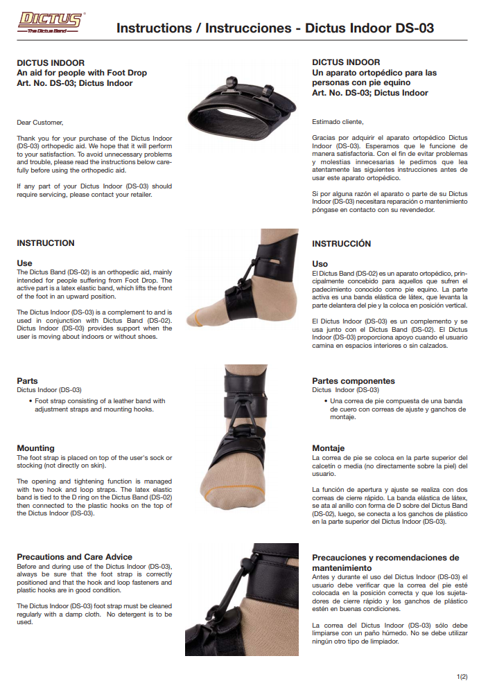 The rubber band - the active part of the orthosis - on the Dictus Band helps keep the front of the foot in an upward position.  When a person puts their foot on the ground, the rubber band helps raise the toes. Dictus Indoor provides support when the user is moving about indoors or without shoes.