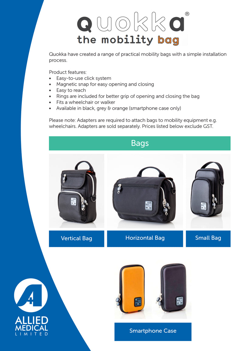 The Quokka Small Bag is a practical bag that simply attaches onto your wheelchair or walker. With one easy installation of an adapter, you'll be all good to go.