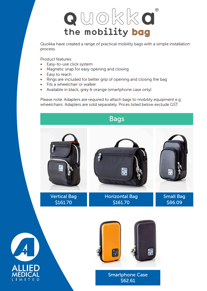 The Quokka Smartphone case is a practical bag that simply attaches onto your wheelchair or walker and fits your smartphone. With one easy installation of an adapter, you'll be all good to go. Available in black only.