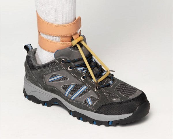 The rubber band - the active part of the orthosis - on the Dictus Band helps keep the front of the foot in an upward position. When a person puts their foot on the ground, the rubber band helps raise the toes. The Dictus Band can be worn with any type of lace-up shoe or sneaker and by locating the rubber band to either the right or left-hand side of the shoelace you can control inversion or eversion.